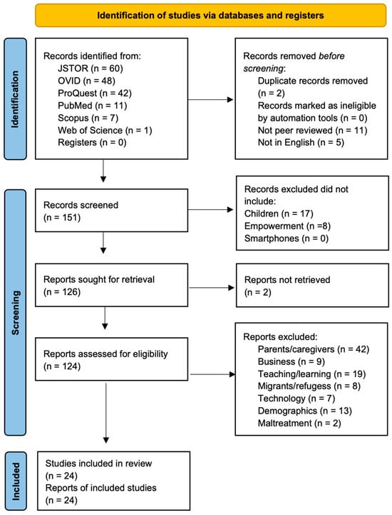 As per the requirements of the PRISMA flow diagram (Page et al. 2021), the databases searched are differentiated only regarding from where it was the records were identified (see Figure 2). Already, once the “Records removed before screening” is undertaken, all records returned of each database are added together. As a result, the duplicate records removed in total were 2. There were no records marked as ineligible by automation tools. Those that were not peer reviewed = 11, and those not in English = 5. This left 151 records screened. Of these, the records excluded that did not include children = 17 and empowerment = 8. There were no records excluded for not including smartphones. This left 126 reports sought for retrieval with 2 reports not retrieved. Of the 124 reports assessed for eligibility, reports were excluded for concerning the following: parents/caregivers = 42, business = 9, teaching/learning = 19, migrants/refugees = 8, technology = 7, demographics = 13, and maltreatment = 2. This left 24 studies included, for a total of 24 reports of included studies. However, this requirement for reporting by PRISMA means that the details of the individual searches are not presented in the flow diagram. These details are thus presented as follows.