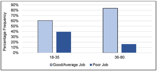 Ratings of victim treatment in court were found to be impacted by the demographic factor of age (see Figure 2). More of those aged between 18–35 years old rated the court’s ability to help victims as ‘poor’ (39.4%) compared to those aged 36 years old and above (16.3%). This difference was found to be statistically significant, X2 (1, n = 114) = 6.8, p = 0.009, with a small effect size (Phi = 0.24). The largest effect was produced by the older age group of respondents who rated the court’s ability to help victims of crime as ‘Poor’ less than would be expected (see Table 4).