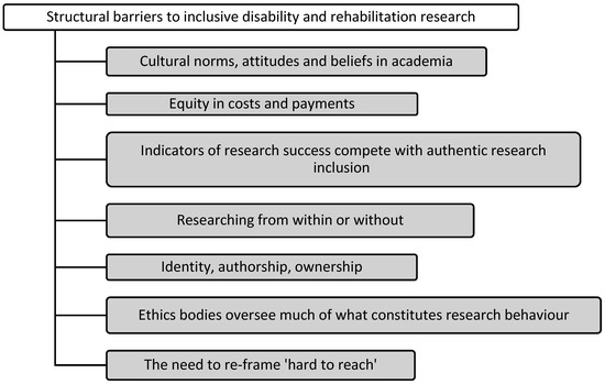 Our collective experiences as researchers in disability and rehabilitation suggest that aspirations to enact inclusion are impeded by structural barriers (see also Williams et al. 2020). Figure 1 lists observed structural barriers to inclusive research. These are discussed in more detail below, alongside examples which demonstrate the opportunity for reimagining disability and rehabilitation research systems and creating the context for inclusive research practices.