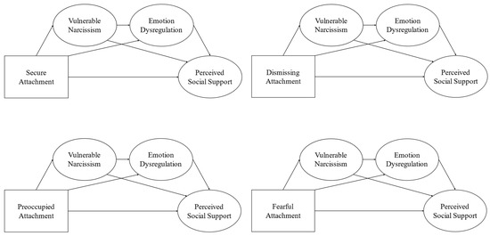 For the subsequent analyses, a Hybrid Structural Equation Modeling (SEM) approach was employed. Attachment styles were treated as observed variables, while vulnerable narcissism, emotion dysregulation, and perceived social support were treated as latent variables. Four separate mediation models, one for each attachment style, were tested. In these models, attachment styles served as predictors, vulnerable narcissism as the first mediator, emotion dysregulation as the second mediator, and perceived social support as the outcome variable (Figure 1). The significance of the indirect effects was assessed using the bootstrap-generated bias-corrected confidence interval approach with 5000 resamples.