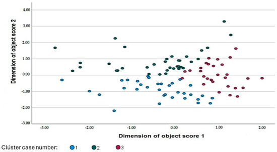 By applying the K-means technique to the two dimensions determined as a result of the multiple correspondence analysis, we obtained three clusters or groups. The distribution was as follows: cluster 1 with 33 entries (34.0% of the total), cluster 2 with 35 entries (36.1%) and cluster 3 with 29 entries (29.9%). Figure 1 shows the distribution of the clusters in the two-dimensional plane.
