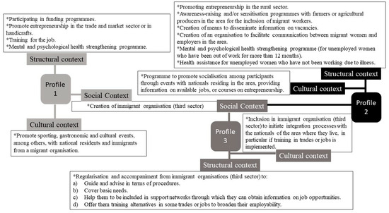 The results presented above, which show the three profiles found for the immigrant women studied, confirm the existence of the diversity of identities proposed by González-Rábago (2014) and, considering the ideas of Spencer and Charsley (2021) discussed in the theoretical foundation, the characteristics that were found influence the integration process, impeding or facilitating it; hence, in the interest of integrating the unemployed immigrant women studied, a set of actions that could contribute to their integration in structural, social, cultural and civic contexts is proposed on the basis of the characteristics of each of the profiles found for these women.