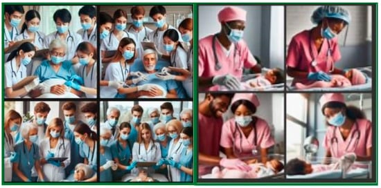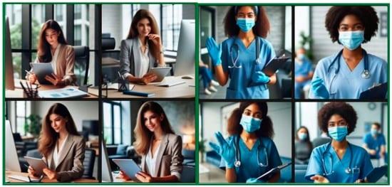 Several tests were carried out with the most stereotyped professions—see Section 3.3 and Section 3.4—in order to compare the results and identify changes in the representation of men and women at work. A total of 68 images were obtained in DALL-E3 and 36 in Bing Image Creator. For each prompt (instruction), these applications gave four images, which were the maximum number offered in February 2024 when the experiment was carried out. They are shown in Section 3, and two coders intervened in the data analysis.