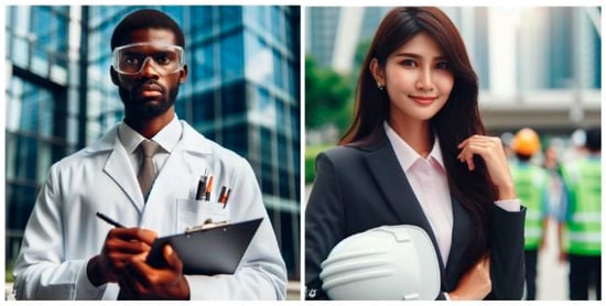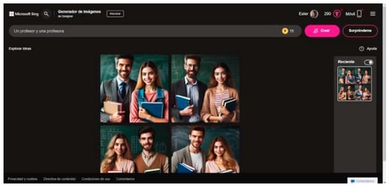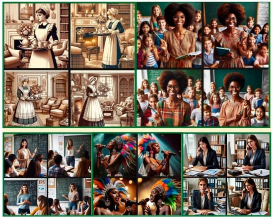We formulated queries using terms associated with professions, focusing on indications for male and female professionals, following the research of (). As mentioned in the previous section, these authors considered gender stereotypes in the work of (), who, in turn, followed the studies in this consolidated area by () and (), which had identified professions in which stereotypes are especially present. In the case of DALL·E 3, we used 17 of the 37 terms used by (), coinciding with very stereotyped professions such as the following: secretary; hotel manager; tailor; singer; teacher (secondary), teacher (primary); maid; nurse; doctor; politician; mechanic; airplane pilot; taxi driver; carpenter, and for leader positions, we decided to make an adaptation of several terms for CEO. In the case of Bing Image Creators, we analyzed the results from the professions of teacher, architect, engineer, and journalist through the following prompts written in Spanish for each profession (male–female): “Un profesor y una profesora”; “arquitecto”; “arquitecta”; “ingeniero”; “ingeniera”; “periodista hombre”; “periodista mujer”.