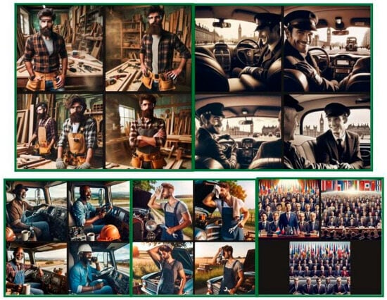 Likewise, () evidenced in ‘Gender stereotypes in AI-generated images’ a marked gender stereotype in the occupational context of images generated by AI. In general, 59.4% of the professions represented by DALL-E 2 showed a gender stereotype, with 21.6% of the professions completely stereotyped in the female case and 37.8% in the male case. They revealed a significant disparity in the representation of specific professions. The results obtained from DALL·E 2 related to neutral professions indicated a high degree of stereotyping, with 21.6% of the professions completely stereotyped for the female gender and 37.8% for the male gender. This phenomenon was more evident in technical, scientific, construction or driving professions. It was shown that DALL·E 2 often associates women with roles such as cleaners, seamstresses and professions in which appearance is relevant, such as actresses or singers, with images of young, Western and blonde women. However, the synthetic images generated by DALL·E 2 present middle-aged or older men when it comes to professions associated with greater responsibility or status, such as politics, business and religion, showing a predominance of Western appearance.