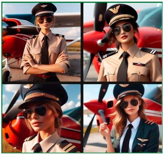 Likewise, in DALL·E 3, women began to be shown in professions such as “airplane pilot” (Figure 6), although they do not come out in control of the plane but alongside it, in a passive attitude, with close-ups or medium shots that are somewhat sexualized as if it were an ad for sunglasses.