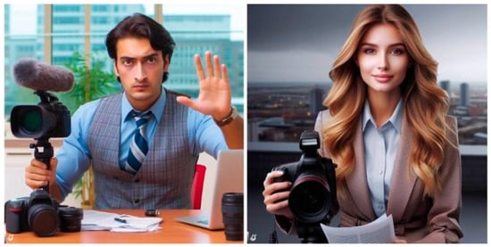 Gender bias is also manifested in the journalistic profession. The male journalist is portrayed as a person with character, in action, with authority, giving instructions, who wears a tie, and is somewhat disheveled, while the female journalist appears with a sweet and accommodating image and with an aesthetically impeccable appearance (Figure 11).