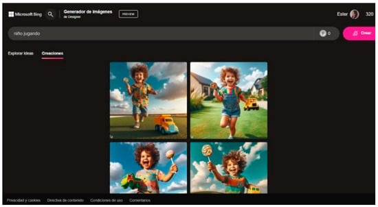 These professions are introduced through prompts in English in DALL·E in order to avoid the use of masculine or feminine terms present in other languages, such as Spanish. The content analysis allowed us to know with which gender was each profession represented and to grade (no, less, much stereotyped) not only how a woman or a man is represented in different professions, but also, as mentioned before, to compare with previous studies. Additionally, we included a sample of children’s images made in Bing Image Creator to assess gender stereotypes from an early age in this system. () also used children IA-generated images to measure the gender bias in relation to objects. In our study, the prompts used were “boy playing” and “girl playing”, also in Spanish. In this case, they were introduced in Spanish (“niño jugando”; “niña jugando”) since, in these prompts, we were not interested in finding out whether they represented a boy or a girl, but rather what the representation was like for these two.