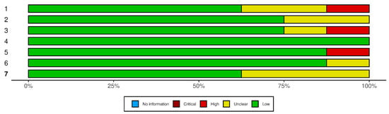 Summary of the critical appraisal based on JBI checklist. The numbers 1 to 7 are the assessed cross-sectional studies.