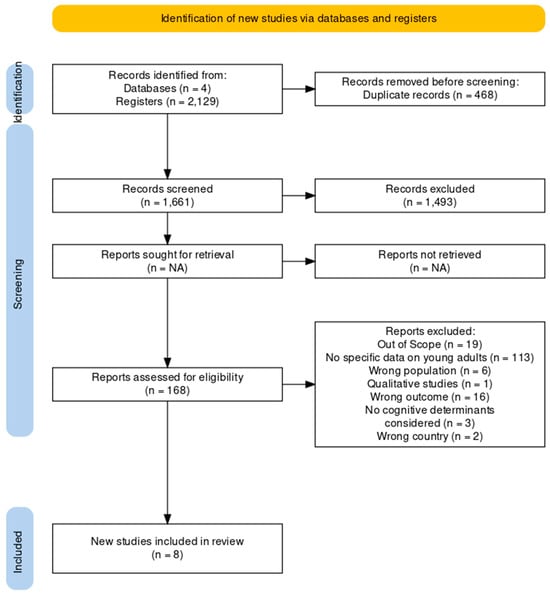 A systematic literature review of quantitative studies was performed to identify the cognitive determinants of adherence to social distance and using masks during the COVID-19 pandemic in young adults. The review was performed using the Preferred Reporting Items for Systematic Reviews and Meta-analysis (PRISMA), which encompassed three phases: Identification, Screening, and Included (Page et al. 2021). The PROSPERO registration number ID is CRD42023405658. The protocol is also available at the following link: https://www.crd.york.ac.uk/prospero/display_record.php?ID=CRD42023405658, accessed on 21 December 2023.