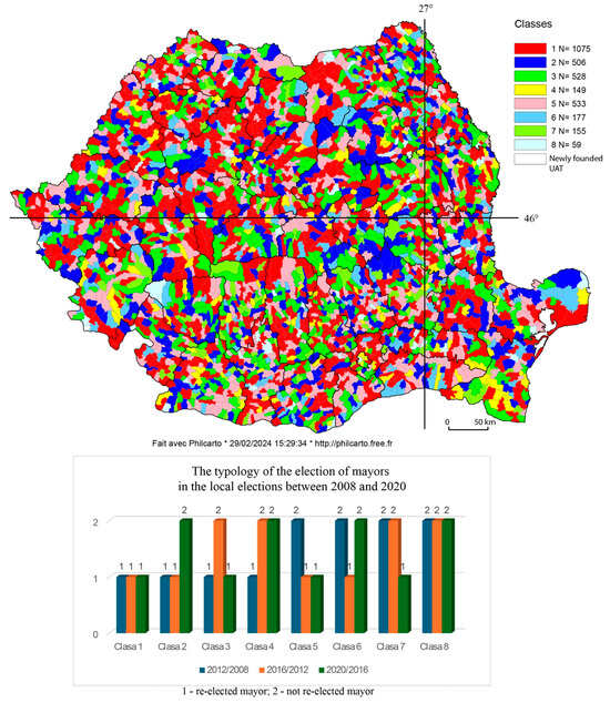 The typology of the election of mayors in Romania between 2008 and 2020: the eight classes. Source: (BEC n.d.; ROAEP n.d.), Rezultate Vot, processed data by the authors accessed on 10 January 2024 (made with Philcarto, http://philcarto.free.fr). * authomatically inserted by the Philcarto.