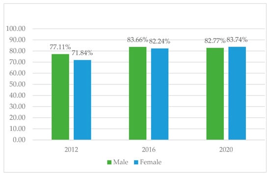The success rate (%) of male and female incumbents for 2012, 2016, and 2020 elections. Source: Processed by the authors using (BEC n.d.; ROAEP n.d.), Rezultate Vot data.