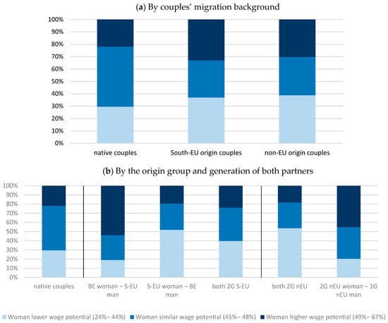 Figure 1a shows the distribution of women’s pre-birth relative wage potential by couples’ migration background and shows clear differences between the three origin groups considered in this study. Whereas women have a pre-birth wage potential similar to their partner among half of native couples (49%), this amounts to 30% among both South-EU and non-EU origin couples. In turn, compared to native couples, there is a larger proportion of South-EU and non-EU origin couples where the female partner has either a higher or lower pre-birth relative wage potential. Furthermore, Figure 1b shows that the distribution of women’s pre-birth relative wage potential among South-EU and non-EU origin couples varies depending on the origin group and generation of both partners. Regarding South-EU origin couples, we find that a smaller proportion of mixed-origin couples where women have a similar pre-birth wage potential implies a larger proportion of couples where the native partner has a higher pre-birth wage potential. The distribution of South-EU origin couples with two second-generation partners is largely similar to that of native couples. With respect to non-EU origin couples, women have a lower pre-birth wage potential among half of non-EU couples where both partners are of the second generation (54%), while women have a higher pre-birth wage potential among 45% of non-EU origin couples with a second-generation woman and a first-generation man.