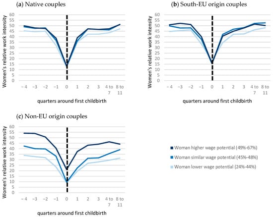 Change in partners’ work intensity around the transition to parenthood by women’s relative wage potential, non-EU origin couples. Source: MIA Panel 2005–2016, calculations by authors.