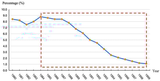 The proportion of the textile and clothing industry in Hong Kong’s GDP from the 1980s to the 1990s. Source: (). Economic breakthrough: where is the way out?—from the rise and fall of Asia’s “four little dragons” to see the direction of China’s transformation. Changjiang Securities Research Institute. https://pdf.dfcfw.com/pdf/H3_AP201809191198138633_1.pdf (accessed on 5 February 2024).