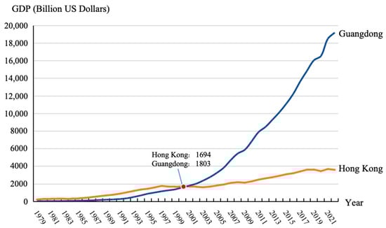 Comparison of GDP growth between Guangdong and Hong Kong. Source: (), 2016 Guangdong statistical yearbook. http://tjnj.gdstats.gov.cn:8080/tjnj/2016/ (accessed on 5 February 2024); (). Hong Kong foreign direct investment statistics (1979–2021). https://www.censtatd.gov.hk/tc/EIndexbySubject.html?scode=260&pcode=B104000 (accessed on 5 February 2024).
