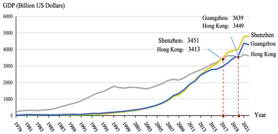 Comparison of GDP growth among Guangzhou, Shenzhen and Hong Kong. Source: (). 2016 Guangdong statistical yearbook. http://tjnj.gdstats.gov.cn:8080/tjnj/2016/ (accessed on 5 February 2024); (). Hong Kong foreign direct investment statistics (1979–2021). https://www.censtatd.gov.hk/tc/EIndexbySubject.html?scode=260&pcode=B104000 (accessed on 5 February 2024).