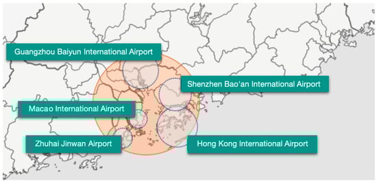 Distribution map of major airports in the Guangdong–Hong Kong–Macao Greater Bay Area. Source: ( (), 29 August). Greater Bay Area airports: The fine line between competition and cooperation. Euromonitor International. Available online: https://www.euromonitor.com/article/greater-bay-area-airports-the-fine-line-between-competition-and-cooperation (accessed on 19 January 2024).