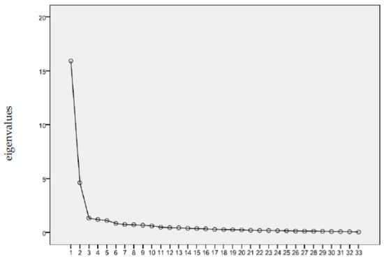 The translation of factor weights via the sediment graph is presented in Figure 1 below and shows how the 33 questions are distributed in terms of their factor weights and eigenvalues. Summarized via factor analysis, three components were recorded: the first with 56%, the second with 42%, and three with a weight of 1%. In other words, there are two very solid rocks and one sediment with a low weight.