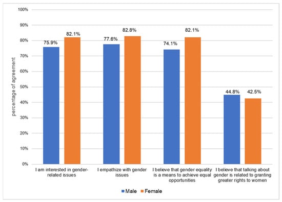 Based on Figure 2, it is positively highlighted that teachers from the different educational establishments showed affinity for gender issues and their relation to equal opportunities. On this point, there was not such a pronounced difference between women (82.09% agreement) and men (74.14% agreement), which indicates that people are aligned with the idea of gender equality and that even beyond interest, they feel identified with the issue, which means a solid baseline that provides support for the subsequent findings, with the exception of talking about gender, where only 42.54% of women and 44.83% of men agree that talking about gender is only related to granting greater rights to women.