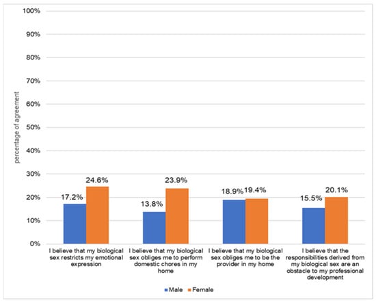 Therefore, it can be subdivided into two themes: (1) the existing affinity on gender issues according to sex (items 1 to 4) and (2) the perception of gender stereotypes according to sex (items 5 to 8). Below are some graphs showing the results in relation to the first dimension of personal perception of gender.
