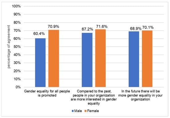 Percentage of agreement on the perception over time of gender equality in your organization by gender.