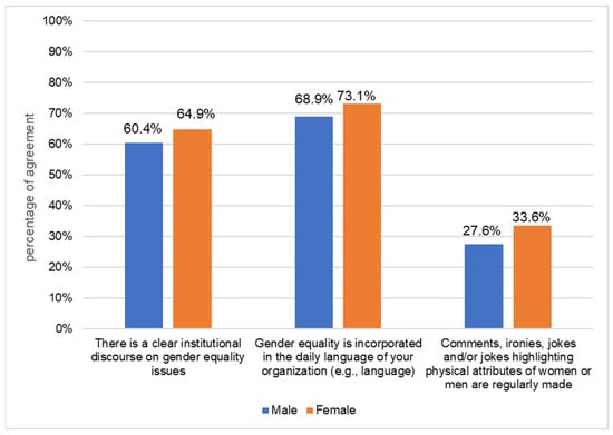 Percentage of agreement on the perception of gender equality in different ways of using language in your organization according to gender.