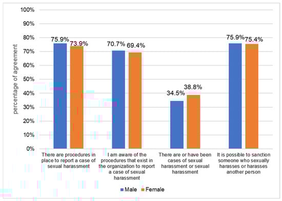 Percentage of agreement on sexual harassment/harassment procedures, cases, and sanctions in your organization by gender.