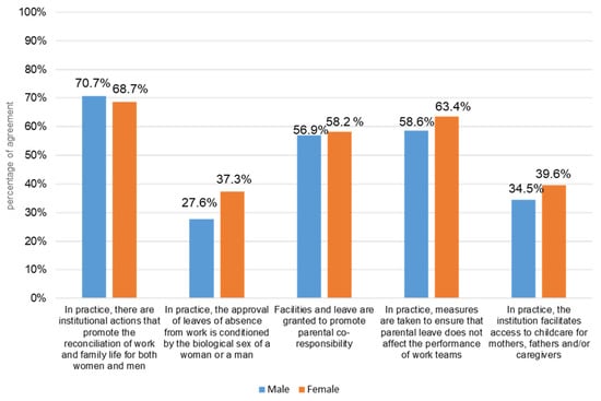 In general, it is clear from Figure 7 that there is no major incompatibility between work and family life. Thus, an average of 70% of women and men agree that there are institutional actions that allow for the reconciliation of work and family life for both women and men. In the same line, () indicates that work–life balance practices play a significant role in women’s labor force participation.