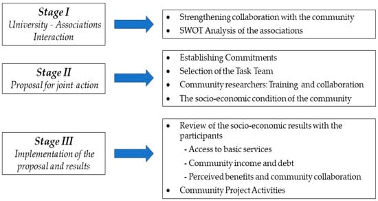 This stage focuses on the action-participation process through dialogue, mediation, and interaction between the university, associations, and communities. This action-participation process allowed the formation of working groups and the construction of diagnostic mechanisms based on the needs of the participants, with the university acting as a channel for these requirements. The stage considers several activities developed from the strategies obtained with the SWOT analysis, which allowed the action and participation of the stakeholders: (i) The establishment of commitments; (ii) The selection of the work team by the university; (iii) The formation and collaboration of a group of partners who were designated as researchers, representing the community; (iv) The design of the survey to know the social and economic situation, by collecting primary information in-situ from the members of the association. These activities generally require workshops and information sessions, allowing people not involved in decision-making (local authority) to collaborate in the proposal.