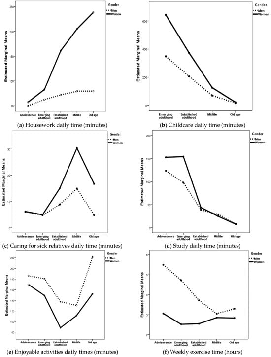 In the ANOVA with daily time spent on enjoyable activities as the dependent variable, post hoc analyses with Games–Howell’s adjustment showed statistically significant differences between women and men in established adulthood and old age, while the differences between women and men in emerging adulthood were p = 0.001, with men spending more time than women. The analysis of within-group differences showed that women in established adulthood spent less time per day in enjoyable activities than all other women and men, and women in midlife spent less time than women and men in adolescence, emerging adulthood, and old age. Men in established adulthood and midlife spent less time per day in enjoyable activities than all other men. Men in old age spent the most time per day in enjoyable activities, although the differences with men and women in adolescence and men in emerging adulthood were not statistically significant. As shown in Table 3 and Figure 1e, women on average spend less time on enjoyable activities than men, although the differences are smaller in adolescence and midlife than in the rest of the life cycle.