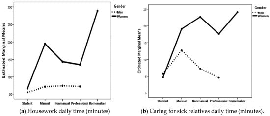 In the ANOVA with daily time spent caring for sick relatives as the dependent variable, post hoc analyses with the Games–Howell adjustment showed statistically significant differences between women and men in the non-manual and professional occupational categories. The within-group analyses showed that there were no statistically significant differences between men in different occupational groups in the time spent per day caring for sick relatives, and for women, differences were only observed between students and the other groups of women, with student women spending less time caring for sick family members. As shown in Table 4 and Figure 2b, women spent more time caring for sick relatives than men in all occupational groups except students.