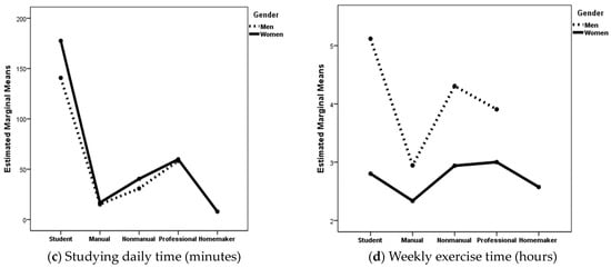 In the ANOVA with weekly exercise time as the dependent variable, post hoc analyses with the Games–Howell adjustment showed statistically significant differences between women and men in the same occupational category only for students and non-manual workers. The analysis of within-group differences showed that men who were students spent more time per week in physical exercise than men who were manual workers and professionals, and men who were not manual workers spent more time than men who were manual workers. As shown in Table 4 and Figure 2d, men spent more time per week in physical exercise than women, although the differences between women and men in manual occupations were smaller.