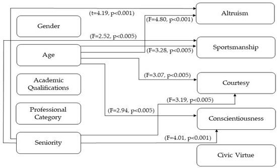 At the higher education level, Saleem et al. (2017) conducted a survey among professors from 18 public and private sector universities in Punjab (Pakistan). Their findings showed that sociodemographic and professional variables are important in promoting organizational citizenship behaviors, in their various dimensions, among university professors: sociodemographic characteristics like gender and age are significantly associated with organizational citizenship behaviors, which follow the same line as presented by some studies previously mentioned.