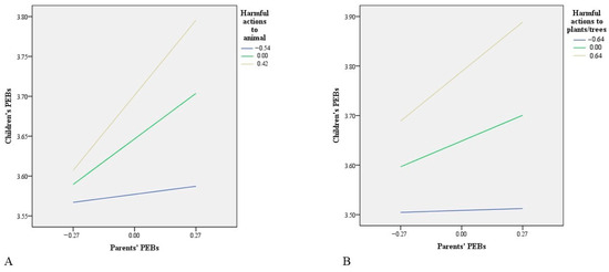 When investigating the moderating effect of harmful actions to animals (Table 2, Model A), results revealed that parents’ PEBs (B = 0.21, SE = 0.08, t = 2.51, CI 95% = [0.045, 0.375]), and harmful actions to animals (B = 0.13, SE = 0.04, t = 3.07, CI 95% = [0.462, 0.211]), positively predicted children’s PEBs. Additionally, harmful actions to animals moderated the association between parents’ PEBs and offspring’s PEBs (B = 0.32, SE = 0.15, t = 2.18, CI 95% = [0.030, 0.612]) at medium (B = 0.21, SE = 0.08, t = 2.51, CI 95% = [0.045, 0.375]) and high (B = 0.35, SE = 0.11, t = 3.11, CI 95% = [0.127, 0.565]) levels (Figure 2A). Additionally, when investigating the moderating effect of harmful actions to plants/trees (Table 2, Model B), results showed that parents’ PEBs (B = 0.19, SE = 0.08, t = 2.49, CI 95% = [0.369, 0.342]), as well as harmful actions to plants/trees (B = 0.22, SE = 0.03, t = 6.70, CI 95% = [0.155, 0.285]), positively predicted children’s PEBs. Furthermore, harmful actions to animals moderated the parents’ PEBs–children’s PEBs link (B = 0.28, SE = 0.13, t = 2.16, CI 95% = [0.024, 0.531]) at medium (B = 0.19, SE = 0.08, t = 2.49, CI 95% = [0.039, 0.342]) and high (B = 0.37, SE = 0.11, t = 3.30, CI 95% = [0.147, 0.587]) levels (Figure 2B).
