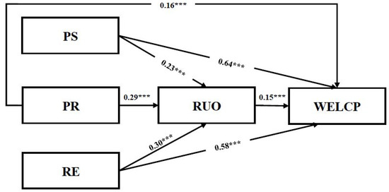 Hayes’ PROCESS macro (model 4) was used to test the mediation hypotheses (Rockwood and Hayes 2017). This study was set up as a bootstrap to obtain bias-corrected 95% confidence intervals for making statistical inferences about specific indirect effects. Figure 2 indicates the standardized coefficients and significance for each path in the hypothesized model. In the first mediation model, PS was a significant predictor of RUO (β = 0.23, t = 5.90, p < 0.001), RUO positively predicted WELCP (β = 0.58, t = 8.61, p < 0.001), and the indirect effect was significant (β = 0.06, t = 9.05, p < 0.001, 95% CI [0.02, 0.12]). The results of the second mediation model indicated that PR was a significant predictor of RUO (β = 0.29, t = 7.49, p < 0.001), and RUO positively predicted WELCP (β = 0.28, t = 5.02, p < 0.001). The indirect effect was significant (β = 0.08, t = 4.62, p < 0.001, 95% CI [0.04, 0.12]). The results of the third mediation model showed that RE was a significant predictor of RUO (β = 0.30, t = 3.90, p < 0.001), RUO positively predicted WELCP (β = 0.24, t = 5.18, p < 0.001), and the indirect effect was significant (β = 0.07, t = 9.76, p < 0.001, 95% CI [0.03, 0.12]). Therefore, H2–4 was supported. Table 2 provides a summary of the hypotheses, proposed relationships and hypothesized relationships, and hypothesis testing results.
