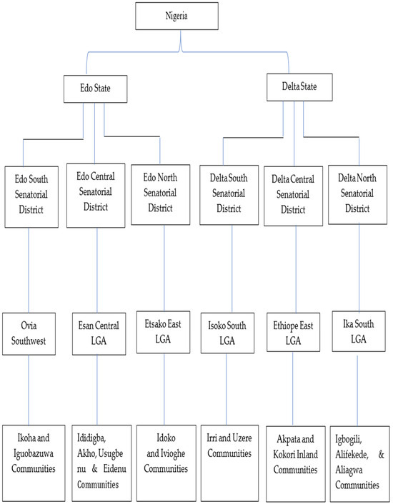 The paper uses a descriptive research design to explore men’s and women’s work and the division of labor among rural households in Edo and Delta states. This qualitative paper using key informant interviews is part of a larger project titled “Gender Inequality and Rural Women’s Health in post-COVID-19 Nigeria: Working with Policymakers and non-state Actors to promote inclusive and Sustainable Rural Women’s Health in Nigeria” with men and women living in rural communities of the three senatorial districts of Edo and Delta states. Qualitative data provides opportunities to hear the voices of women/girls and a deeper understanding of the issues raised by informants (Strauss and Corbin 1998). Strauss and Corbin (1998) maintain that qualitative research is best when the method is congruent with the nature of the research problem and when used to explore areas with minimal knowledge, which is the case in this study. We collected data from convenience and purposively (Suri 2011) and recruited participants 18 years and above using town criers, social influencers, and flyers (Ristock and Grieger 1996). We obtained informed consent before each interview, followed by gathering socio-demographic data to provide background information on the participants to ensure they met the study criteria. We conducted six key informant interviews from each senatorial district, eighteen from each state, with a final total of thirty-six participants from the two states (See Figure 1).