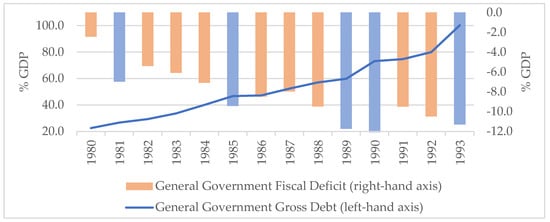 The combination of clientelist politics and an expansionary economic policy resulted in a tremendous increase in the fiscal deficit (Figure 1). During the period 1980–1993, the fiscal deficit averaged an astounding 8.5% of GDP. Fiscal profligacy increased during election years (marked with blue in Figure 1), leading to politically induced budget cycles at both the central government (e.g., Chortareas et al. 2018) and the municipal level (Chortareas et al. 2016). As a result, the debt-to-GDP ratio soared from 22.5% in 1980 to 100% by 1993 (Figure 1).