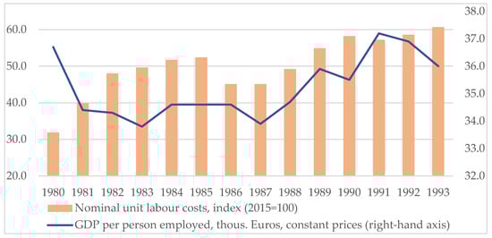Nominal unit labor costs and productivity (1980–1993). Source: AMECO.
