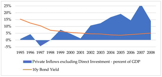 The entry into the Eurozone proved a watershed for Greece’s access to capital; the irreversible monetary link forged between European countries boosted confidence in the prospects of the Southern economies, Greece among them. The elimination of foreign exchange risk and the prospect of a low-inflation environment guaranteed by ECB’s mandate and policy capacity, at a time of unprecedented international liquidity in search of returns, inaugurated a period of large capital inflows to Greece’s economy, precipitating further decline in the cost of capital (Figure 5). The massive inflow of low-cost capital found its way into the Greek economy through two channels: (a) the public sector and (b) the domestic financial system.