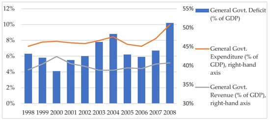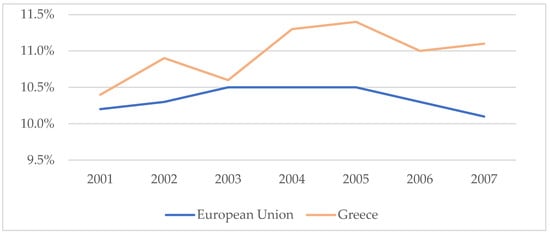 On the revenue side, between 2000 and 2005, there was a steady decline as the adjustment effort relaxed once inside the Eurozone (Figure 6). After 2005, there was a slight increase in revenues, as Greece was subject to an excessive deficit procedure under the corrective arm of the SGP, initiated by the European Commission in 2004 (this explains the slight decline in expenditure in 2005–2006). However, the increase was limited, and after 2007, expenditure rose significantly, widening the deficit further. The fiscal derailment peaked in 2009 when the fiscal deficit reached 15.2% of GDP; the revelations about its true size were the catalyst for the outbreak of the crisis.