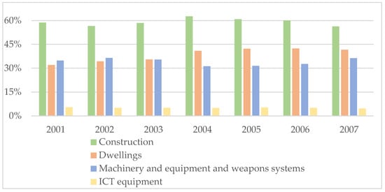 Breakdown of gross fixed capital formation, share of total (2001–2007). Source: AMECO.