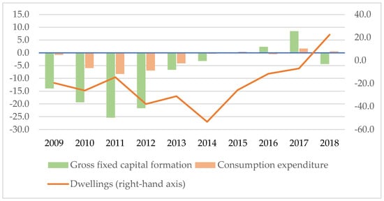 Gross fixed capital formation, investment in dwellings and consumption expenditure, annual percentage change (2009–2018). Source: OECD.