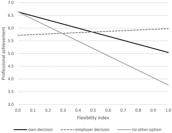 The results indicate that there is moderation between flexibility and professional achievement when taking into account the type of entry into digiwork (β = 1.87; p = 0.03) and lack of opportunities (β = −1.28; p = 0.05). In other words, although the direct effect of flexibility is negative for professional achievement when considering its interaction with digiwork entry, this effect can be attenuated and become slightly positive. This occurs when entry was due to the organization’s determination. However, this attenuation does not occur when the entry was due to lack of opportunity, because the negative effect on professional achievement increases. In brief, flexibility has different impacts on professional achievement depending on the type of entry the worker takes into digiwork. Figure 1 presents the effect of moderation on professional achievement and makes evident that lack of alternatives has the greatest effect on decreasing professional achievement.