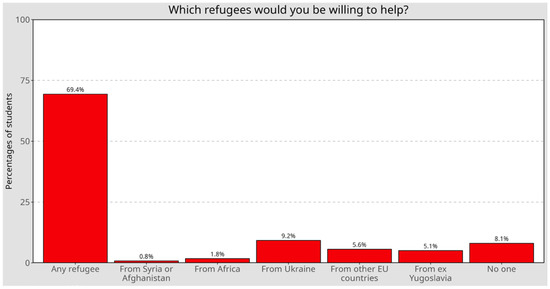 The additional (national) questionnaire asks a series of questions related to refugees in Europe and Slovenia. The first question asks students “Which refugee would you be willing to help?”: (1) all refugees; (2) from Afghanistan; (3) from Africa; (4) from Ukraine; (5) from other EU countries; (6) from former Yugoslavia (e.g., Bosnia, Serbia); and (7) nobody. The students were asked to choose only one of the available options.