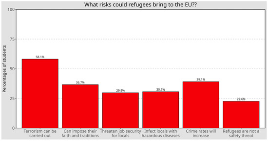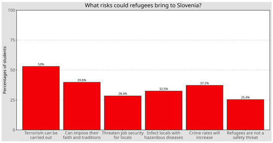 The third question is also a set of subquestions under a common stem (“What are the risks for Slovenia that refugees can bring?”) where students can select all that apply: (1) terrorism can be carried out; (2) refugees can impose their faith and traditions on the local people; (3) refugees may take away employment from the local people; (4) refugees can infect local people with hazardous diseases; (5) the crime rates will increase; and (6) refugees do not endanger the safety of Slovenia.