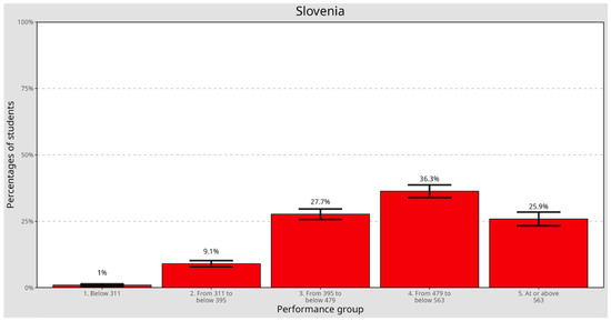 From Figure 5, we see that the percentages of eighth-grade students in Slovenia reaching the last three civic knowledge benchmarks (proficiency levels), which means more complex content in the domain of civic and citizenship education as well as more complex cognitive processes, are much larger than those reaching the first benchmark or below. Most of the students achieve higher benchmark levels of civic knowledge.