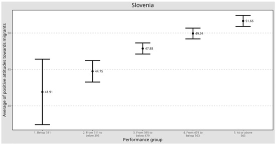 Averages of the students’ positive attitudes toward immigrants at different benchmark levels of achievement.