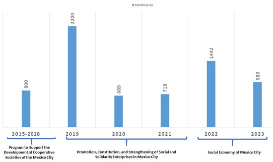 Since 2008, the STyFE has set up programs to promote cooperatives in Mexico City, one of the most representative being the Program to Support the Development of Cooperative Societies of the Mexico City, which boosted entrepreneurship and professionalization of approximately 800 cooperative societies between 2015 and 2018. The STyFE’s Program of Promotion, Constitution, and Strengthening of Social and Solidarity Enterprises in Mexico City benefited 2200 social and solidarity enterprises in 2019, 689 in 2020, and 781 in 2021. In addition, STyFE’s program of Social Economy of Mexico City will benefit 1442 such enterprises in 2022 and 980 in 2023, as shown in Figure 2.