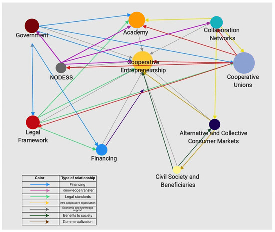 The scheme demonstrates how the legal framework and government funds bolster cooperative organizations. On the one hand, the government generates programs that provide sources of financing for these ventures, and, on the other hand, it promotes technical and organizational training through links with academia. The government also interacts with the cooperative unions to know the context of these organizations, often with the help of the NODESS, which acts as an intermediary between the cooperative sector and the government.